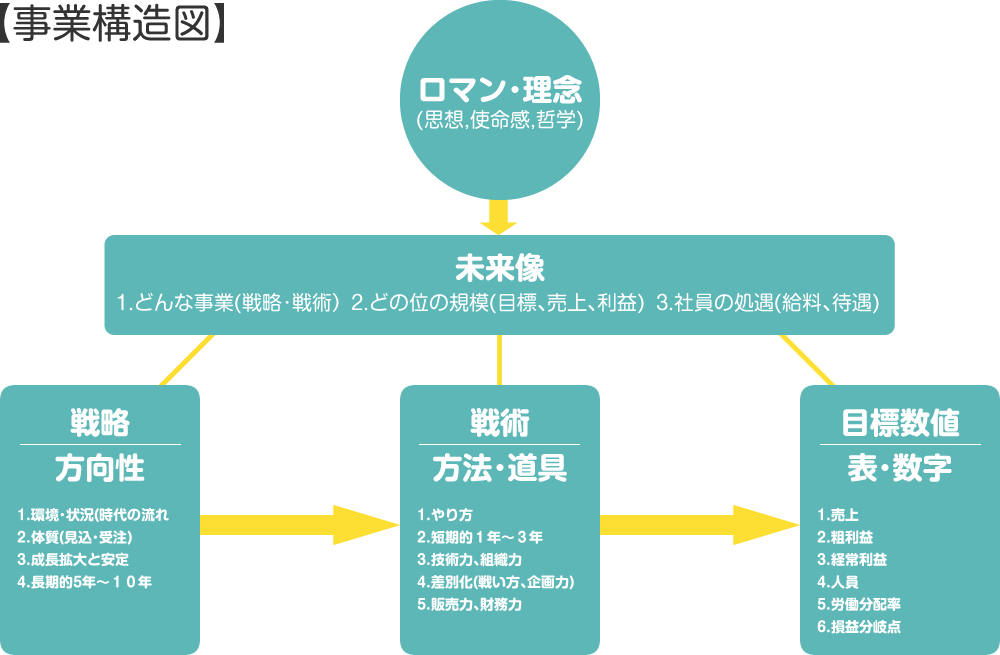 会社を継続させるためには、どのような会社にしたいのか、ワクワクする未来像を経営者がしっかり描き語ることが大切だと思います。そのために、経営計画書を作り、会社が進むべき未来像と皆で共有する夢を明らかにし、達成のプロセスを具体化することが大切です。